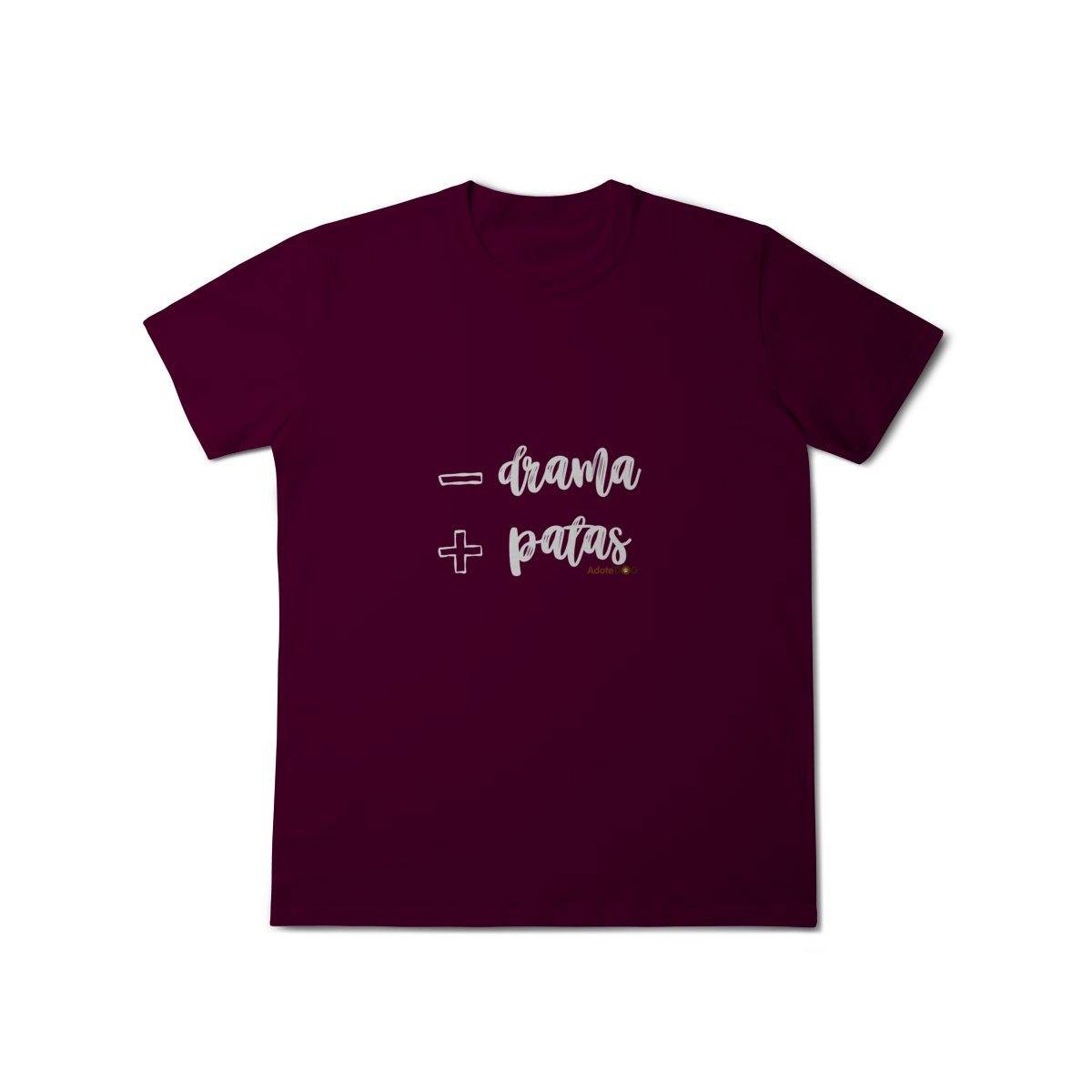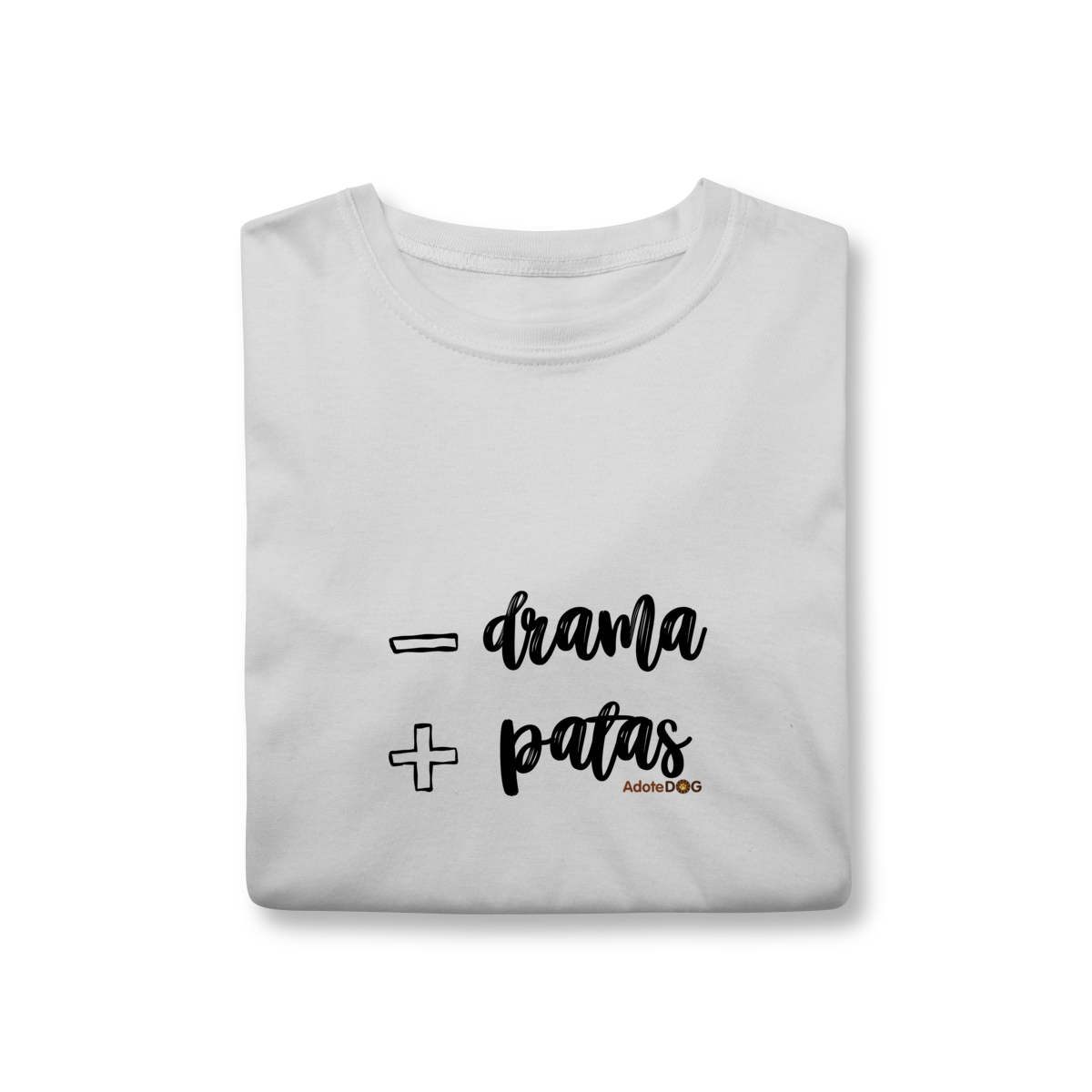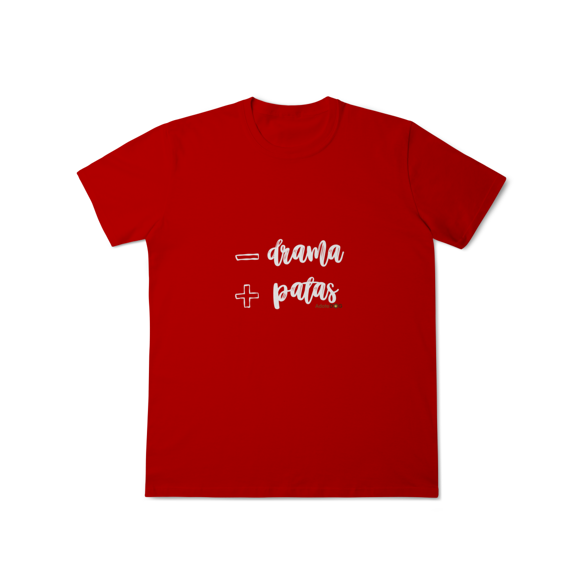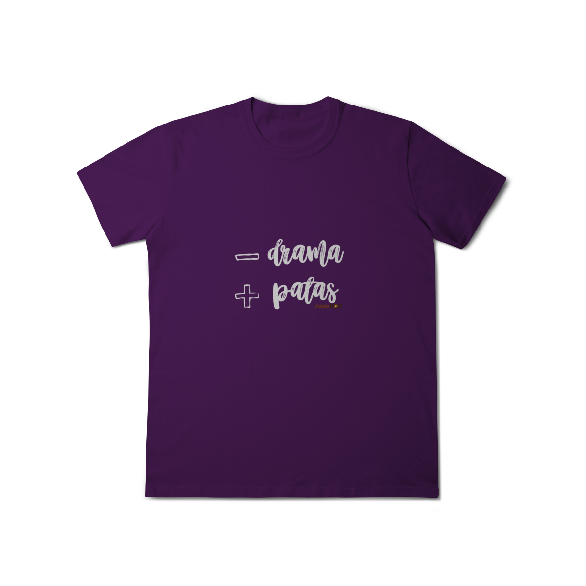 Uma camiseta pra quem escolheu trocar complicação por companhia de quatro patas. A frase “- drama + patas” traz humor, leveza e aquela verdade que só quem ama cachorro entende: a vida fica muito melhor com menos drama e mais patinhas por perto.