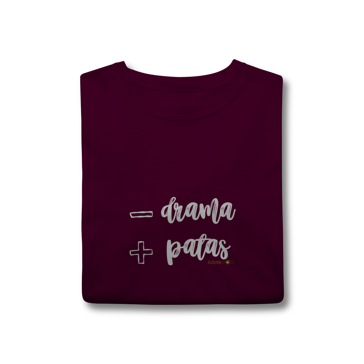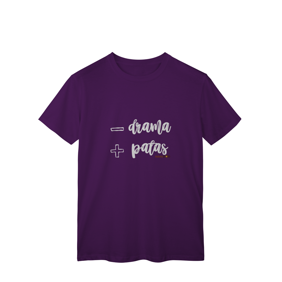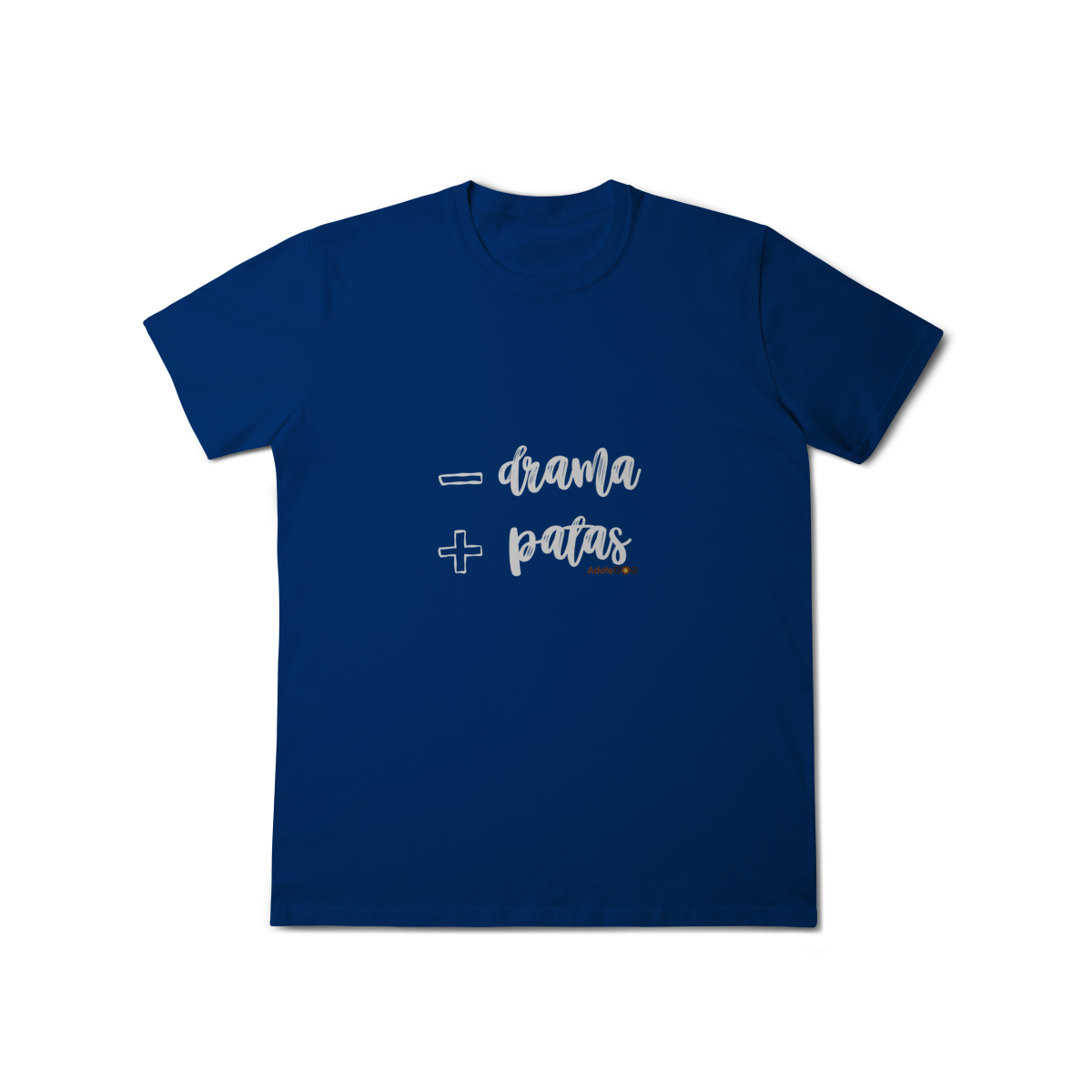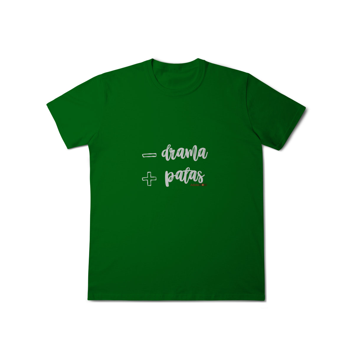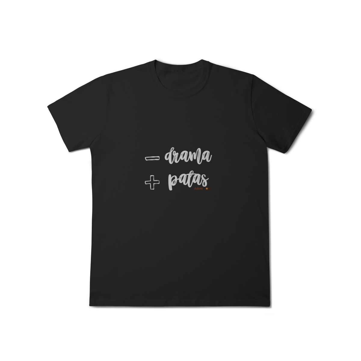 Uma camiseta pra quem escolheu trocar complicação por companhia de quatro patas. A frase “- drama + patas” traz humor, leveza e aquela verdade que só quem ama cachorro entende: a vida fica muito melhor com menos drama e mais patinhas por perto.