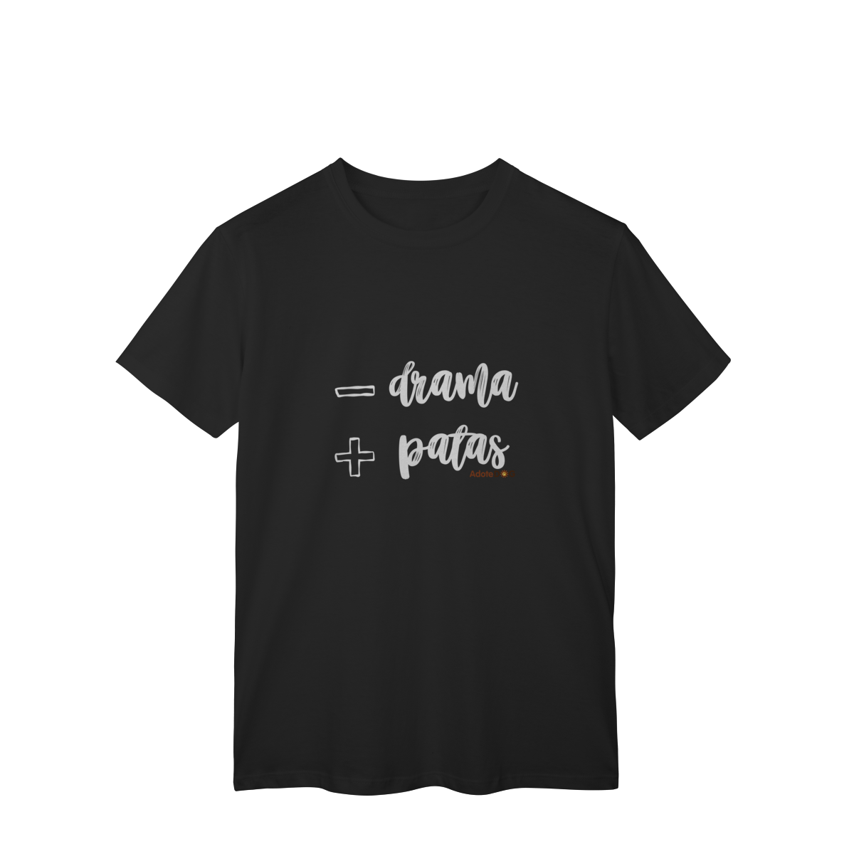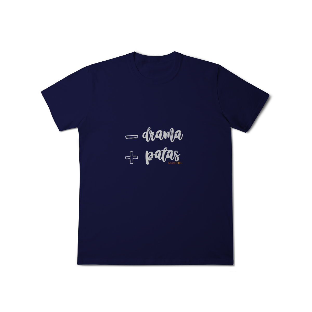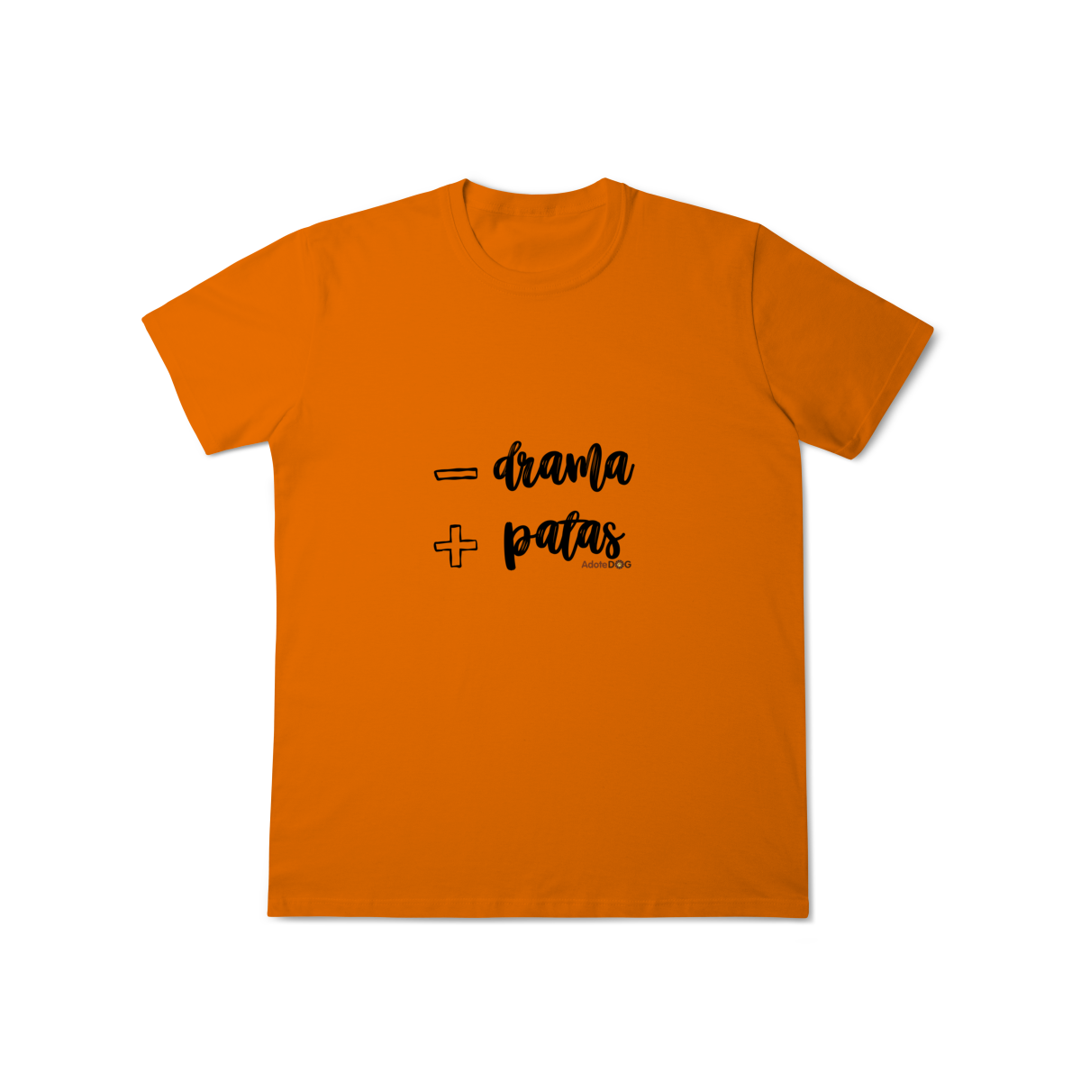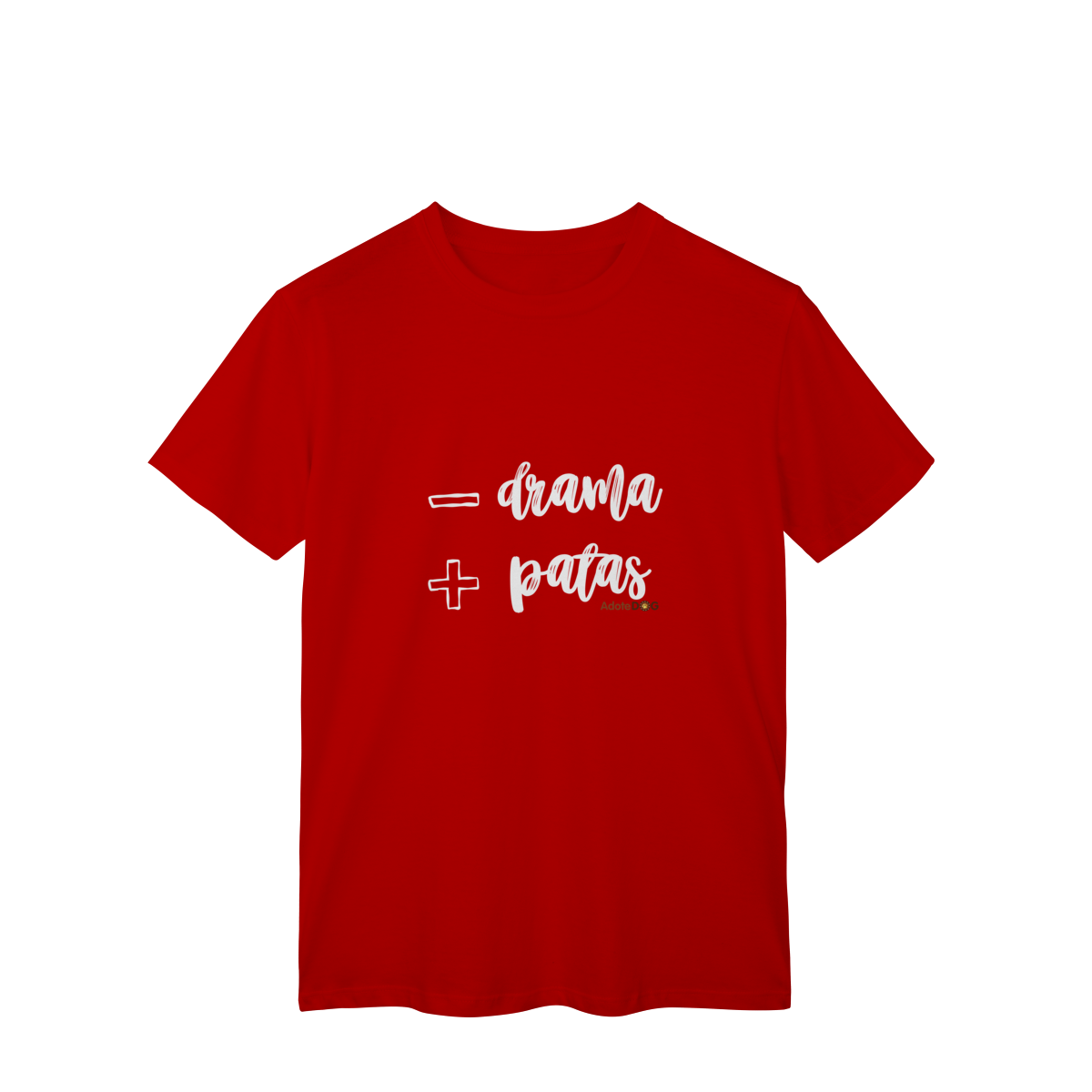 Uma camiseta pra quem escolheu trocar complicação por companhia de quatro patas. A frase “- drama + patas” traz humor, leveza e aquela verdade que só quem ama cachorro entende: a vida fica muito melhor com menos drama e mais patinhas por perto.