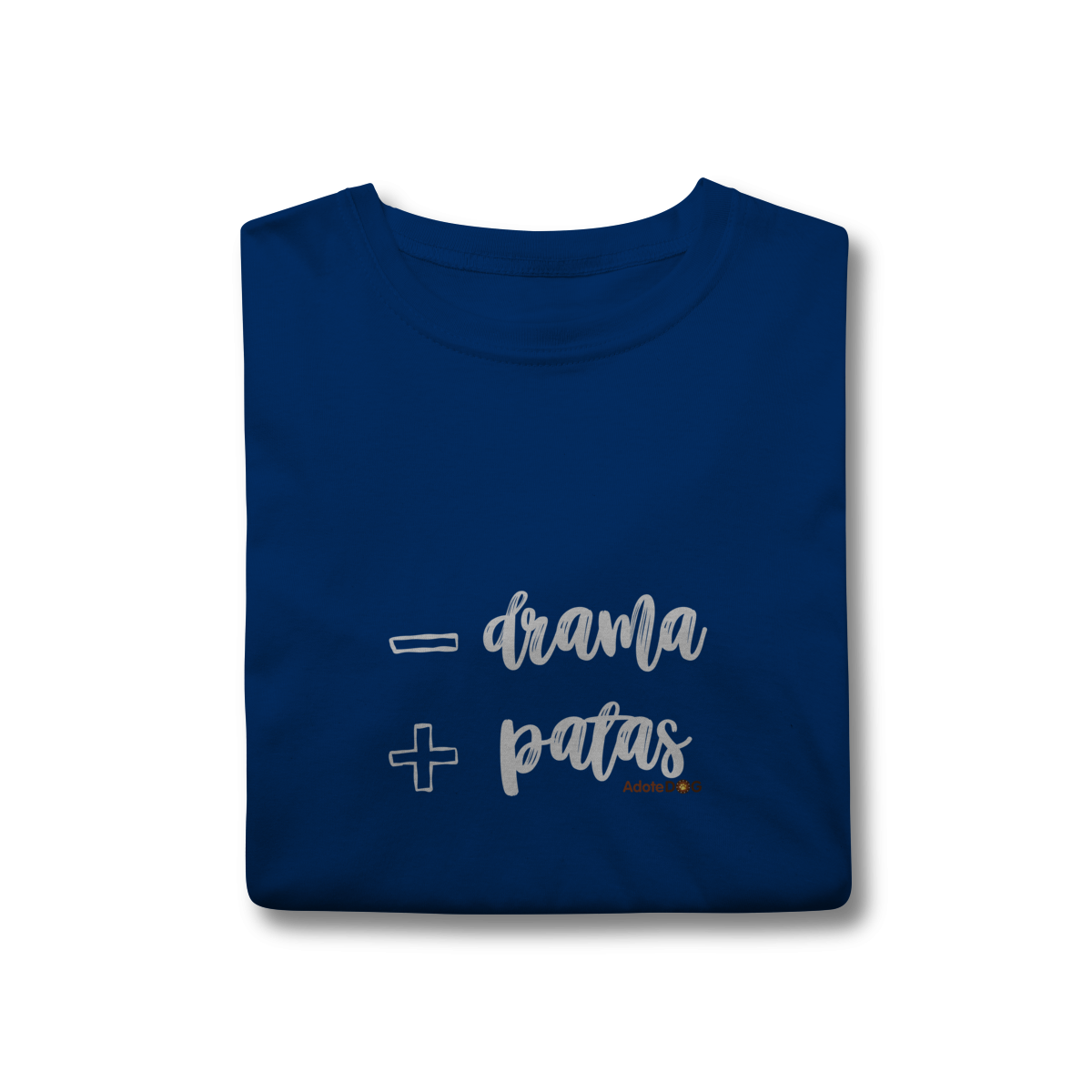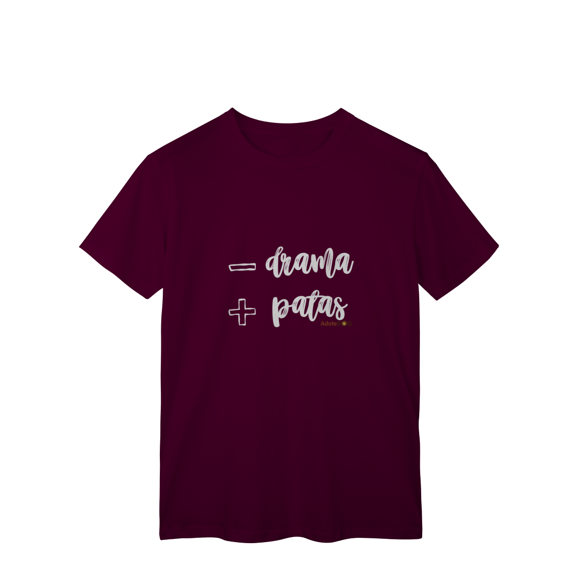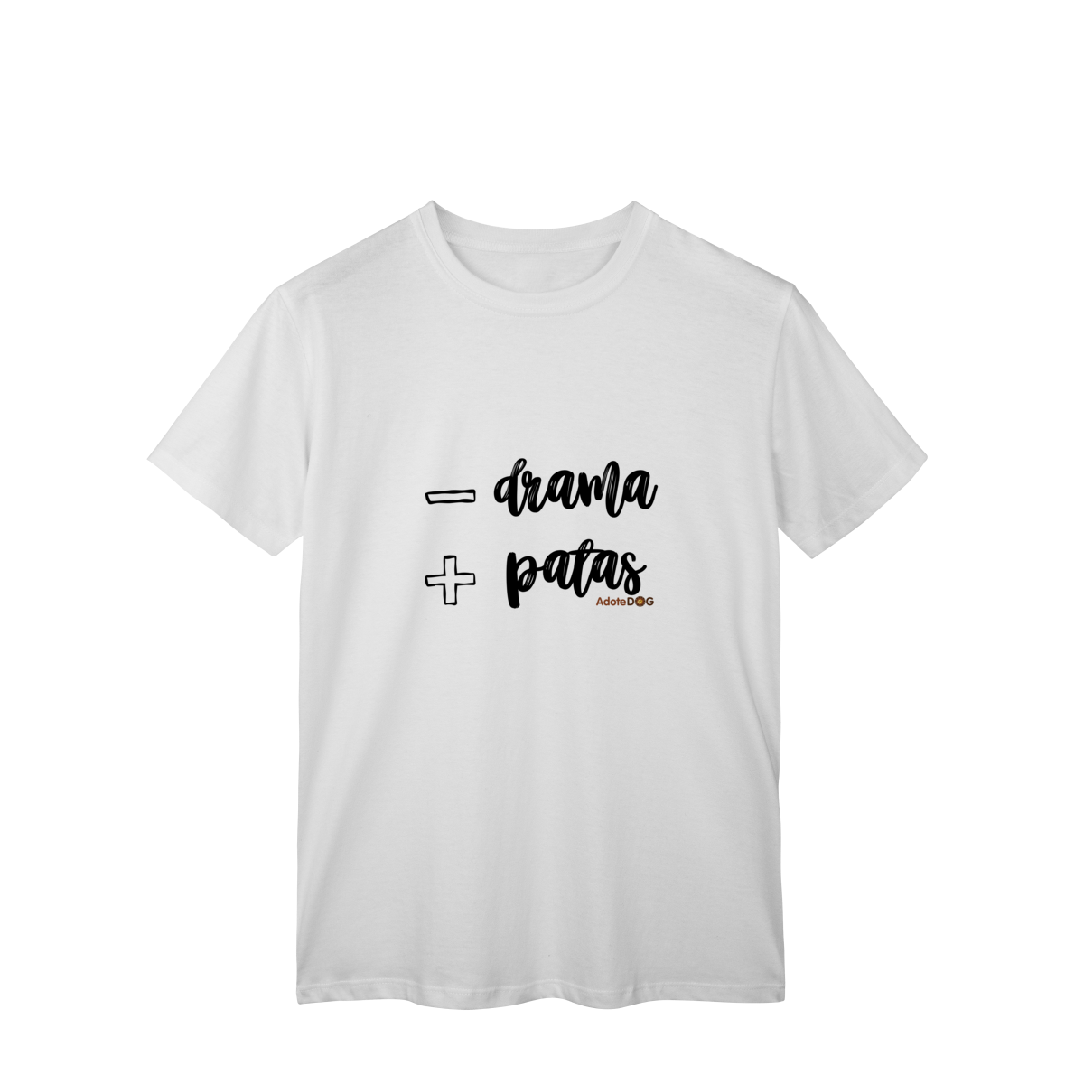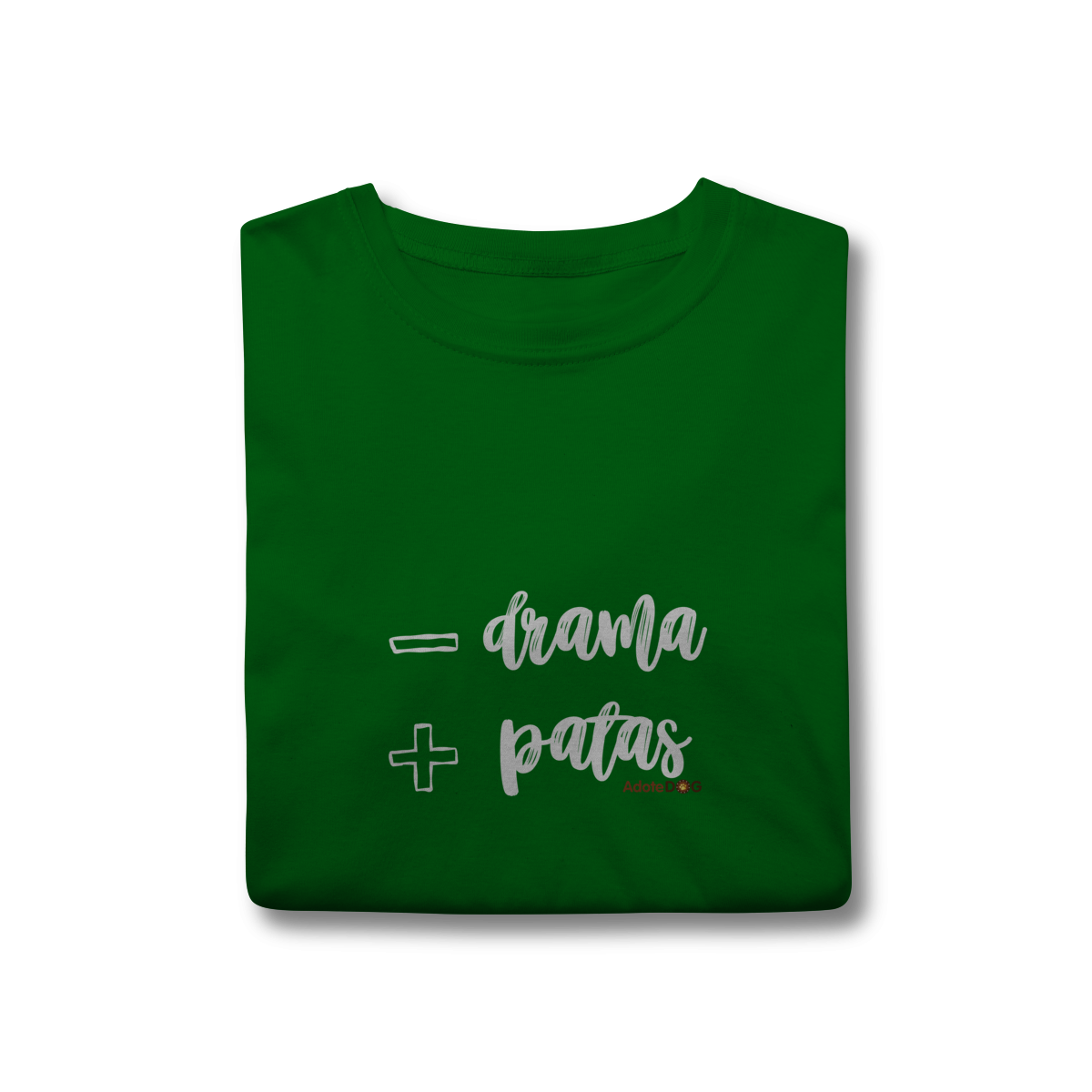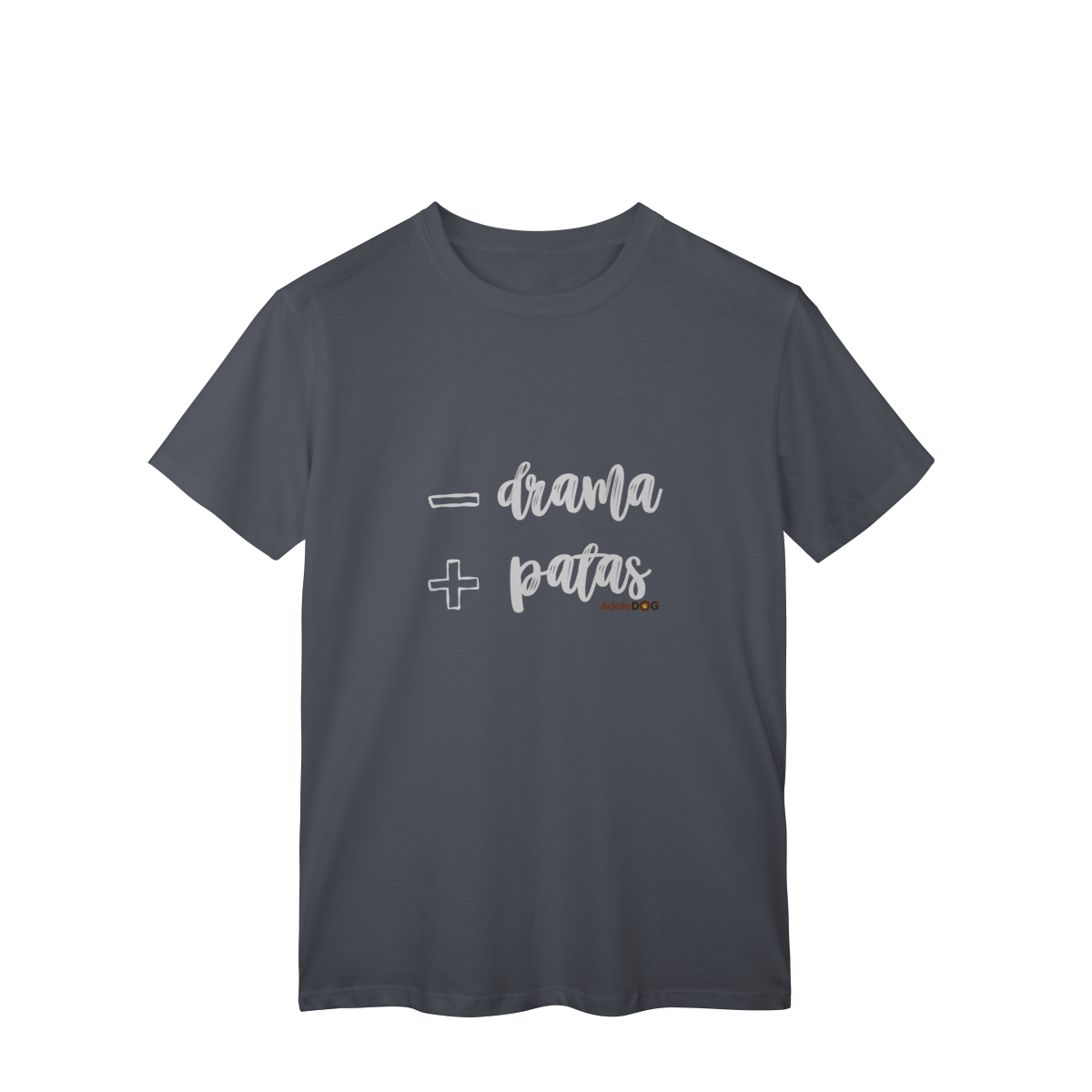 Uma camiseta pra quem escolheu trocar complicação por companhia de quatro patas. A frase “- drama + patas” traz humor, leveza e aquela verdade que só quem ama cachorro entende: a vida fica muito melhor com menos drama e mais patinhas por perto.
