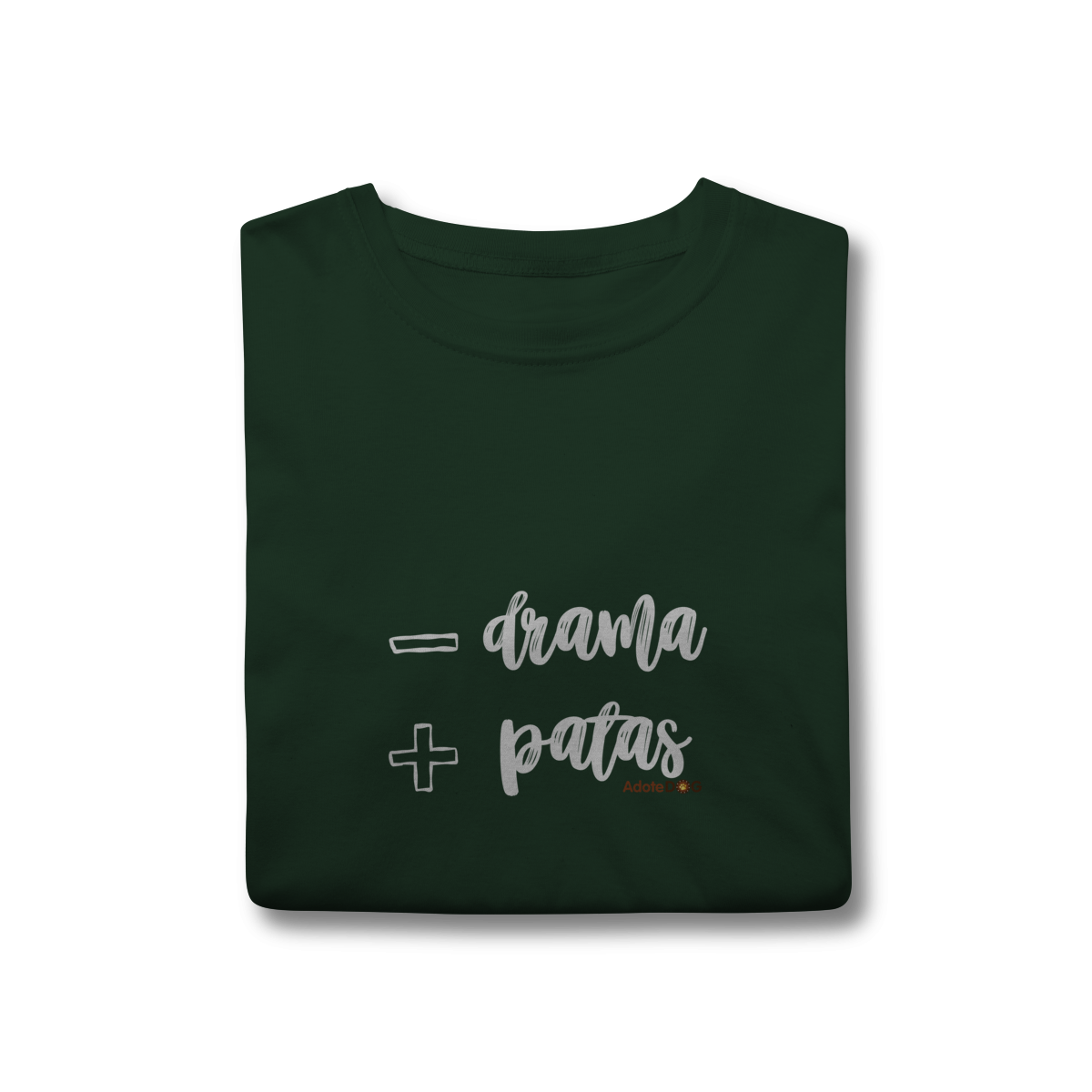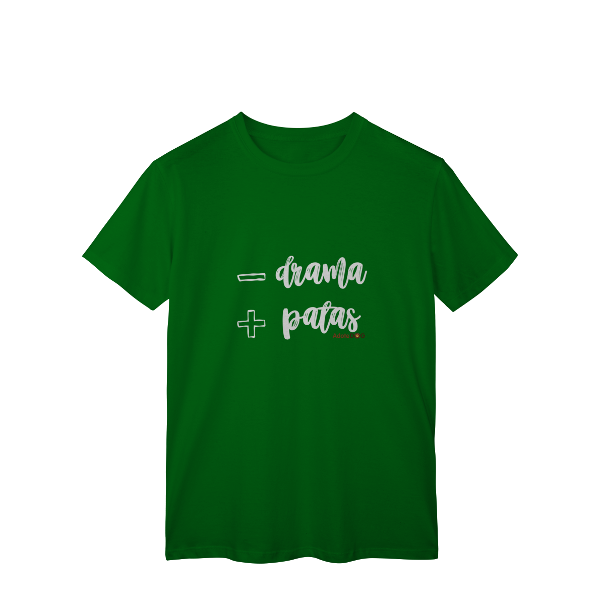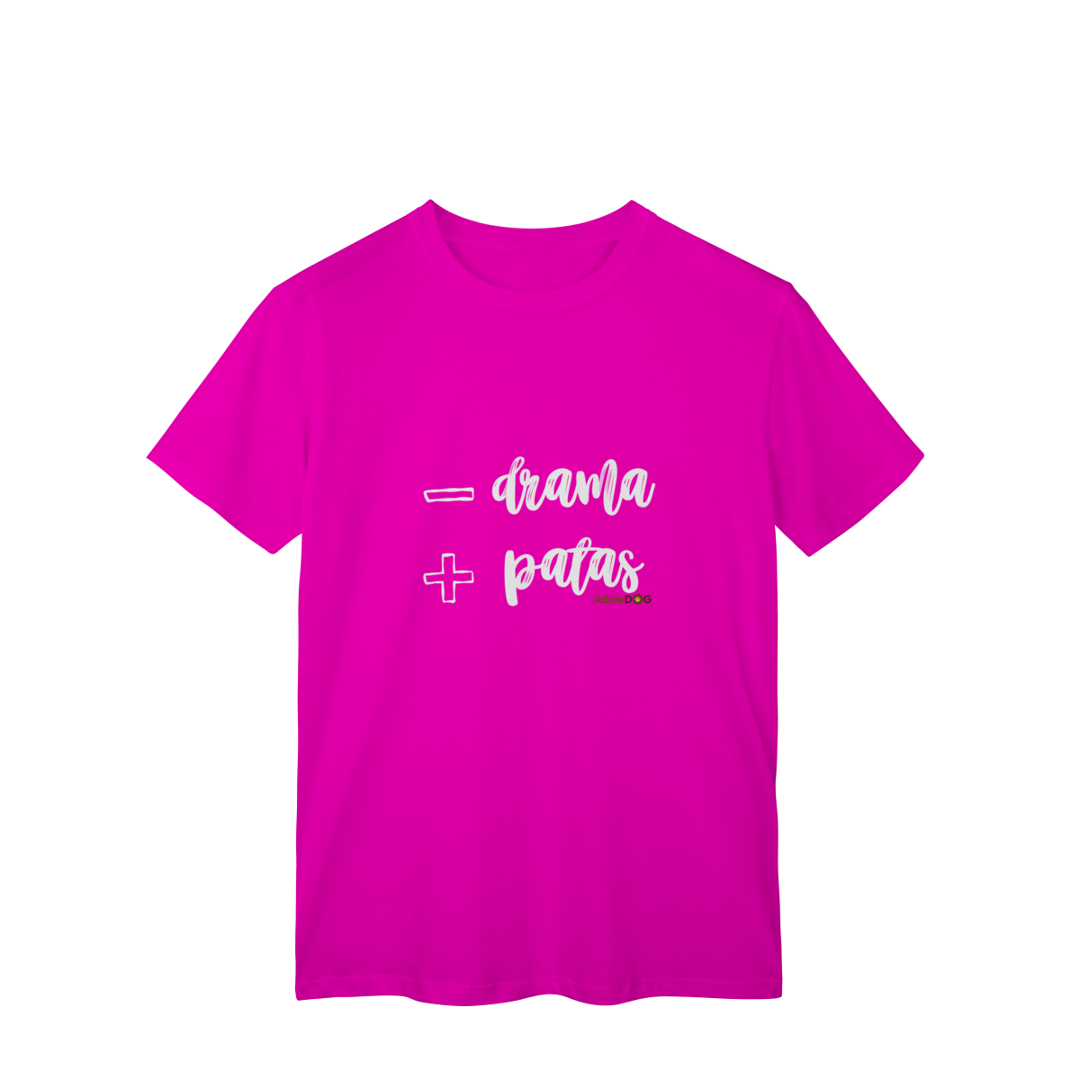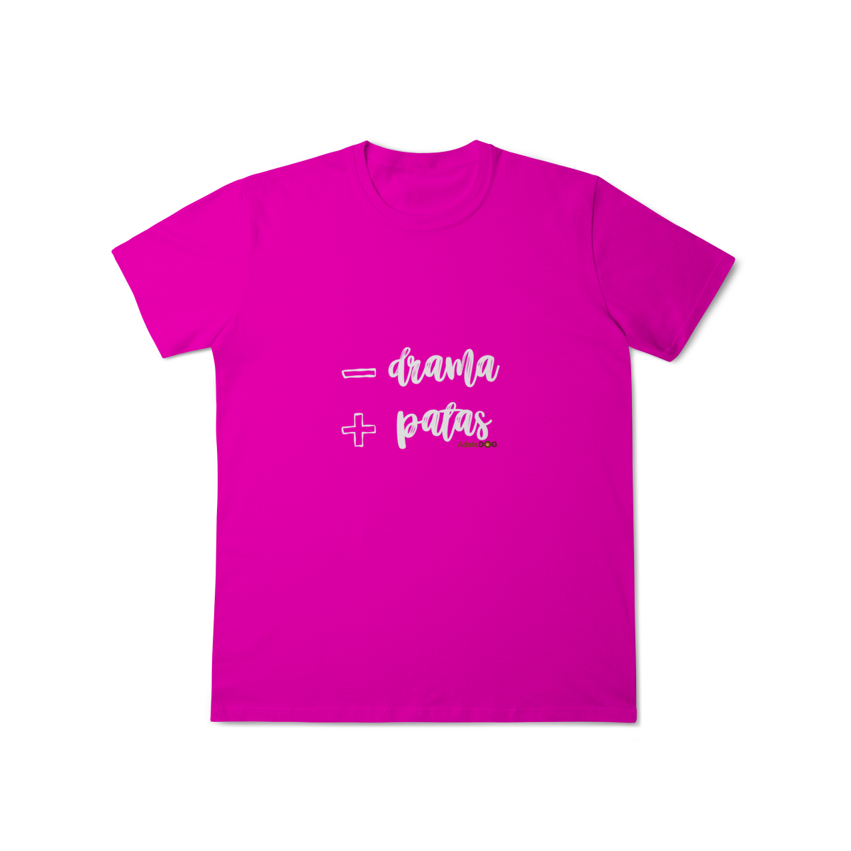 Uma camiseta pra quem escolheu trocar complicação por companhia de quatro patas. A frase “- drama + patas” traz humor, leveza e aquela verdade que só quem ama cachorro entende: a vida fica muito melhor com menos drama e mais patinhas por perto.