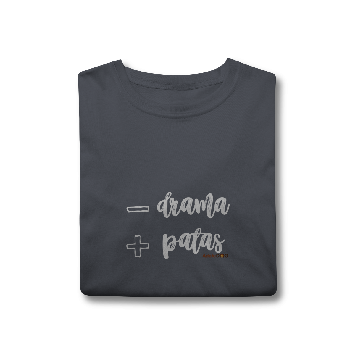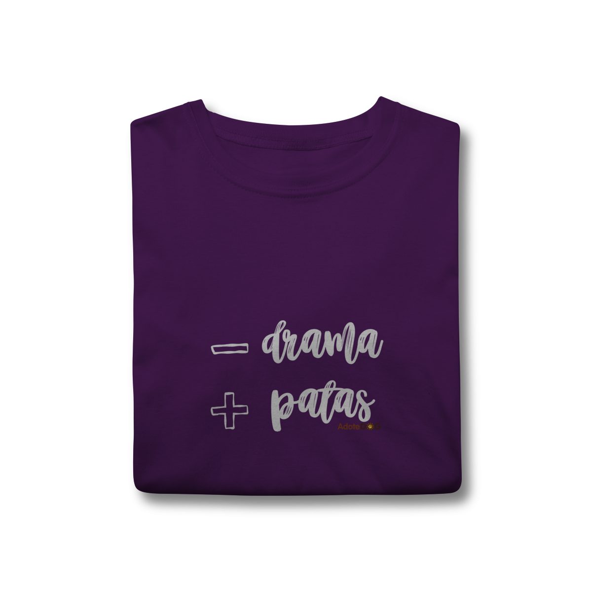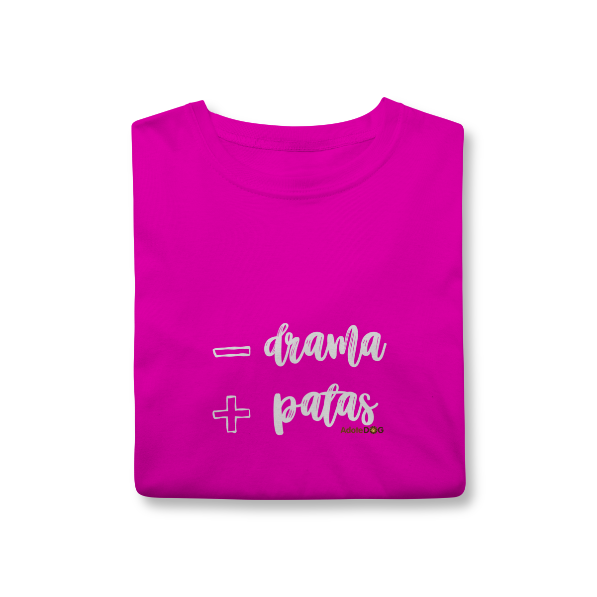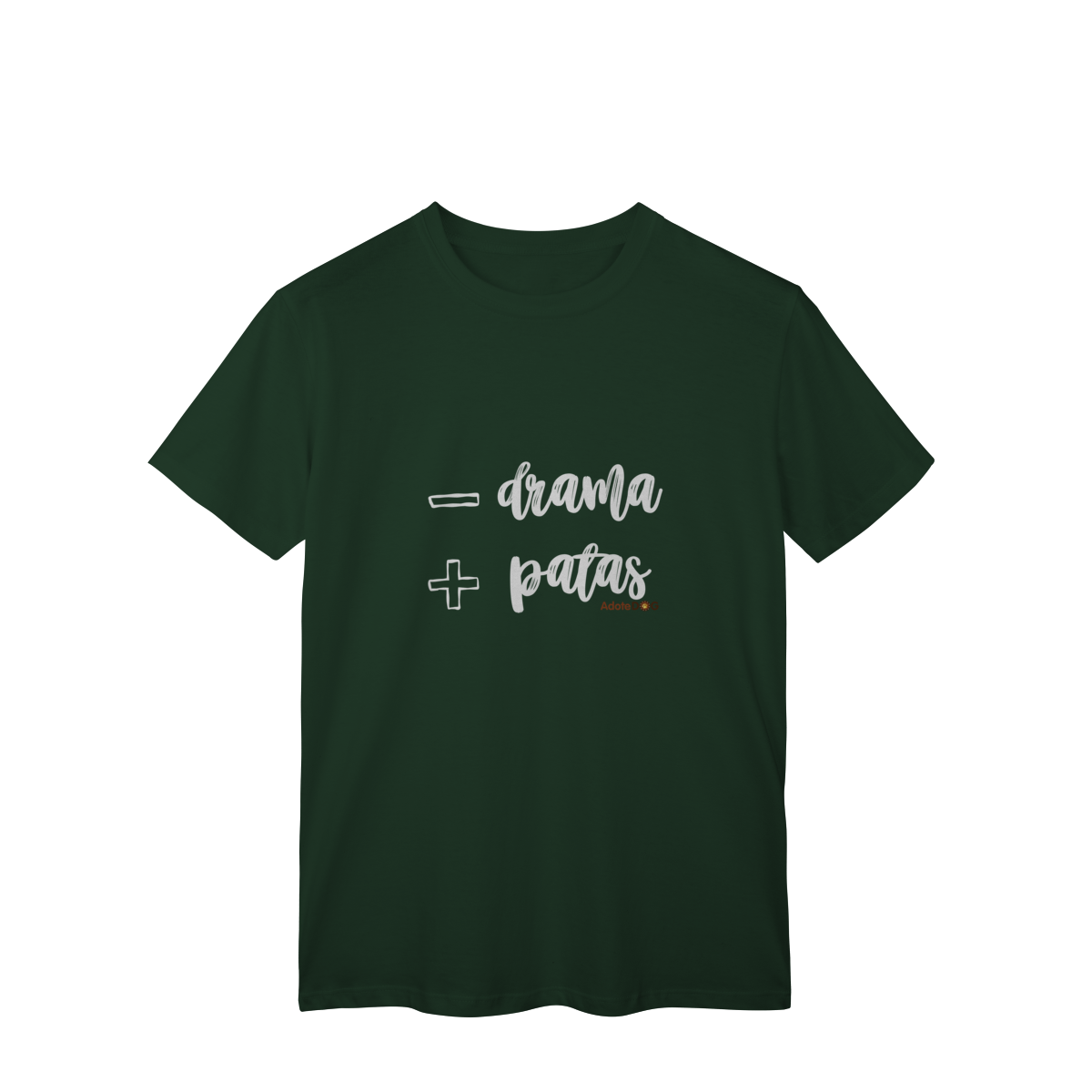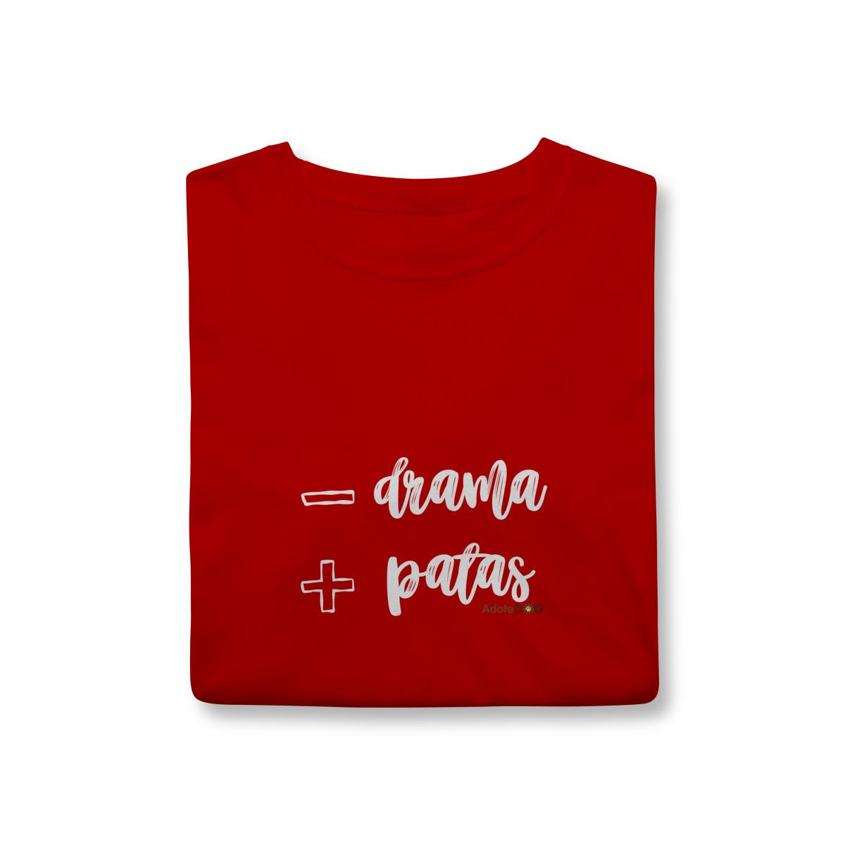 Uma camiseta pra quem escolheu trocar complicação por companhia de quatro patas. A frase “- drama + patas” traz humor, leveza e aquela verdade que só quem ama cachorro entende: a vida fica muito melhor com menos drama e mais patinhas por perto.