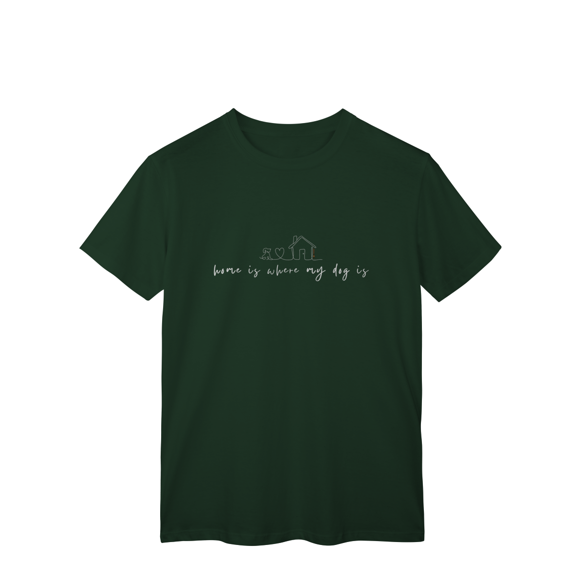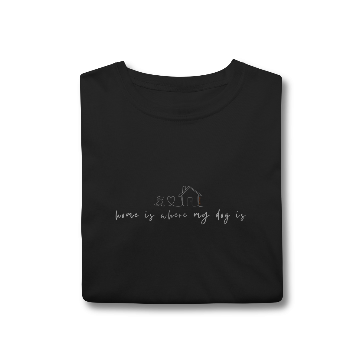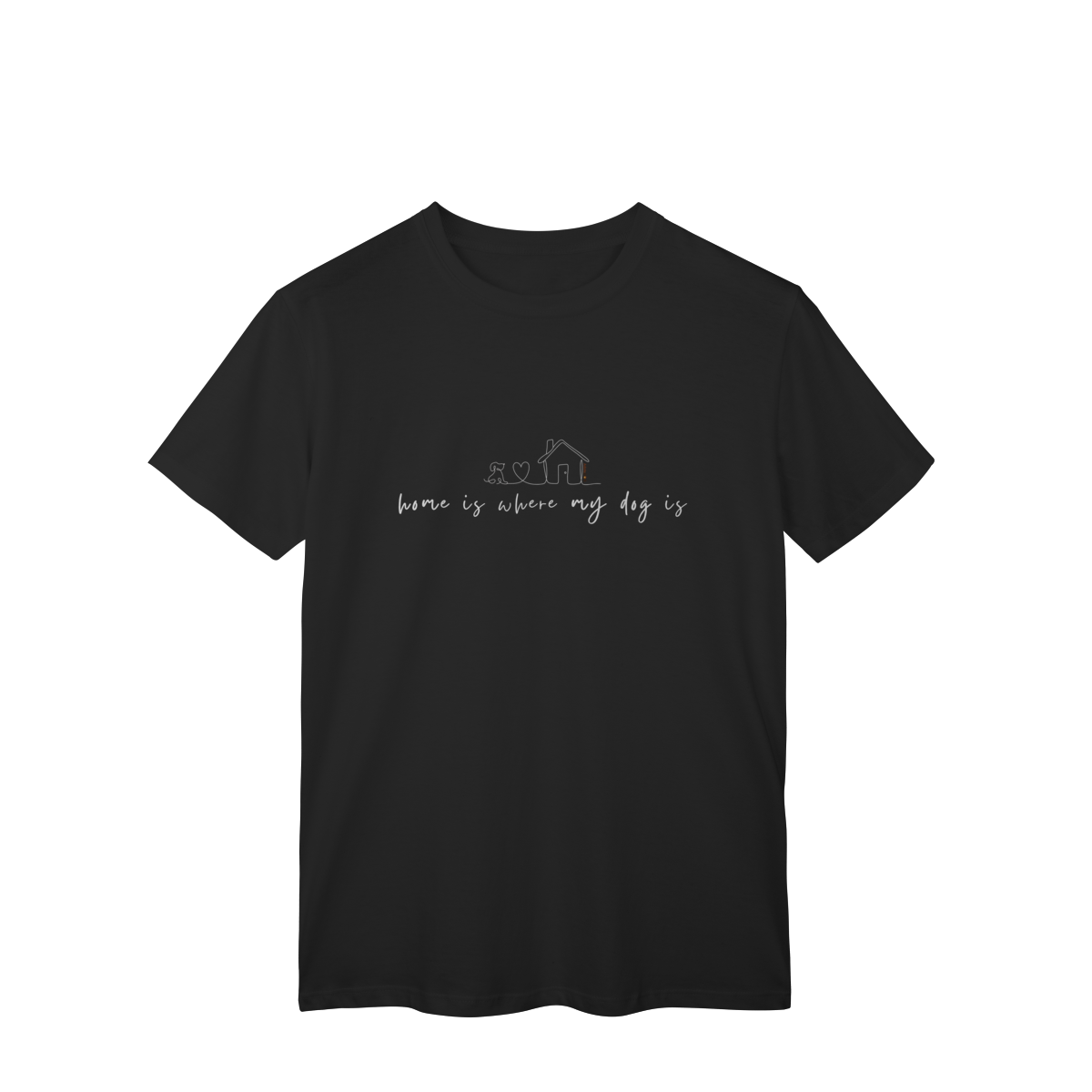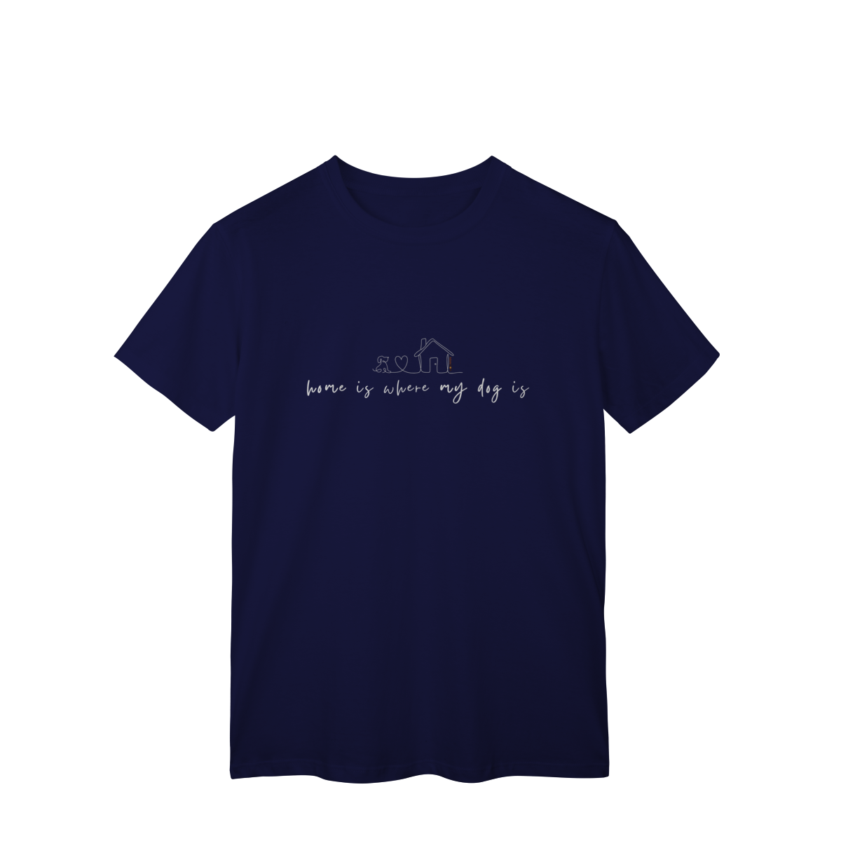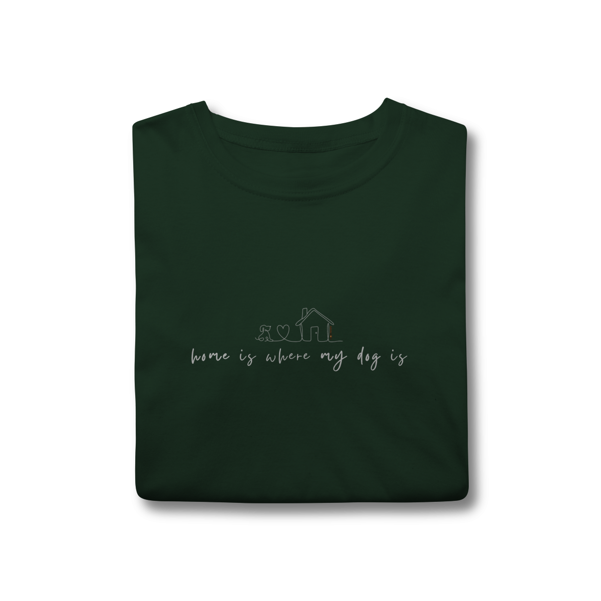 Lar não é um lugar, é quem te espera com o rabinho abanando. A T-shirt clássica com a frase “home is where my dog is” traduz esse sentimento simples e profundo de pertencimento, afeto e aconchego.