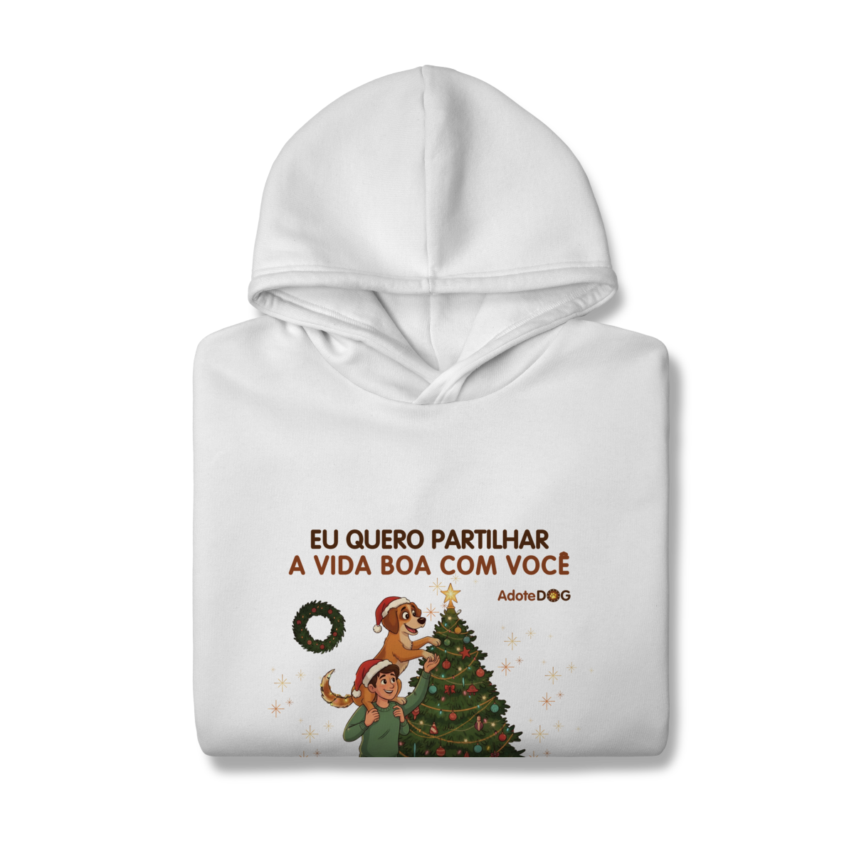 A frase “Eu quero partilhar a vida boa com você” combina com a cena mais fofa: humano e doguinho decorando a árvore — porque o melhor da vida é construir momentos juntos.
