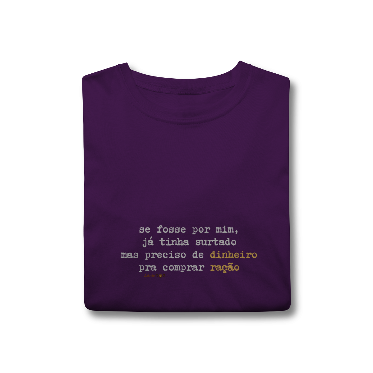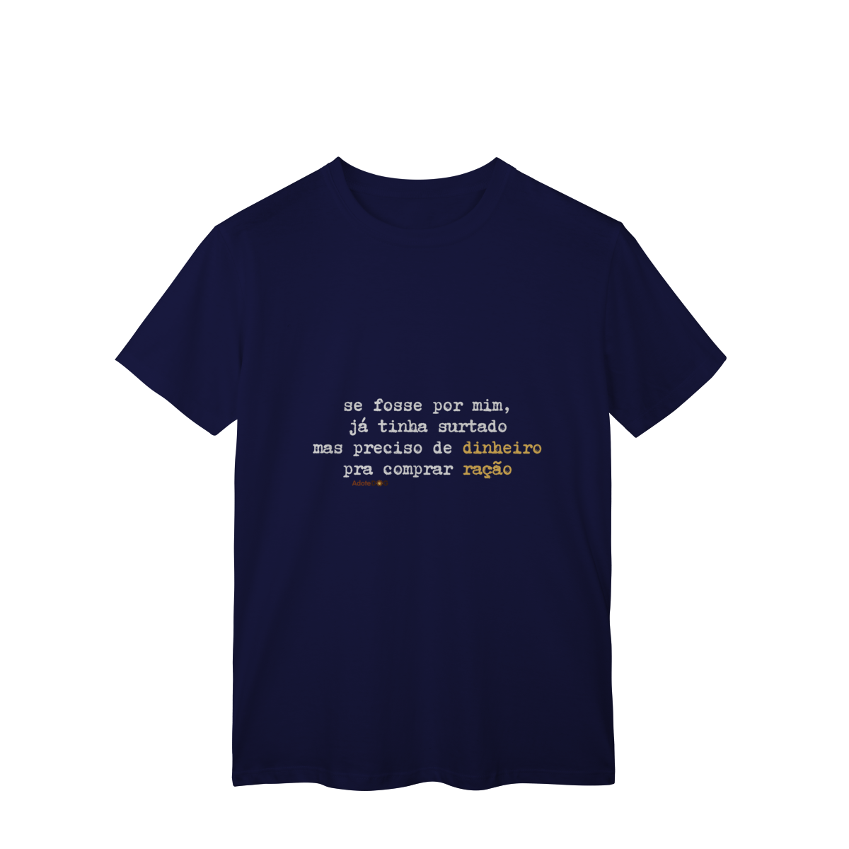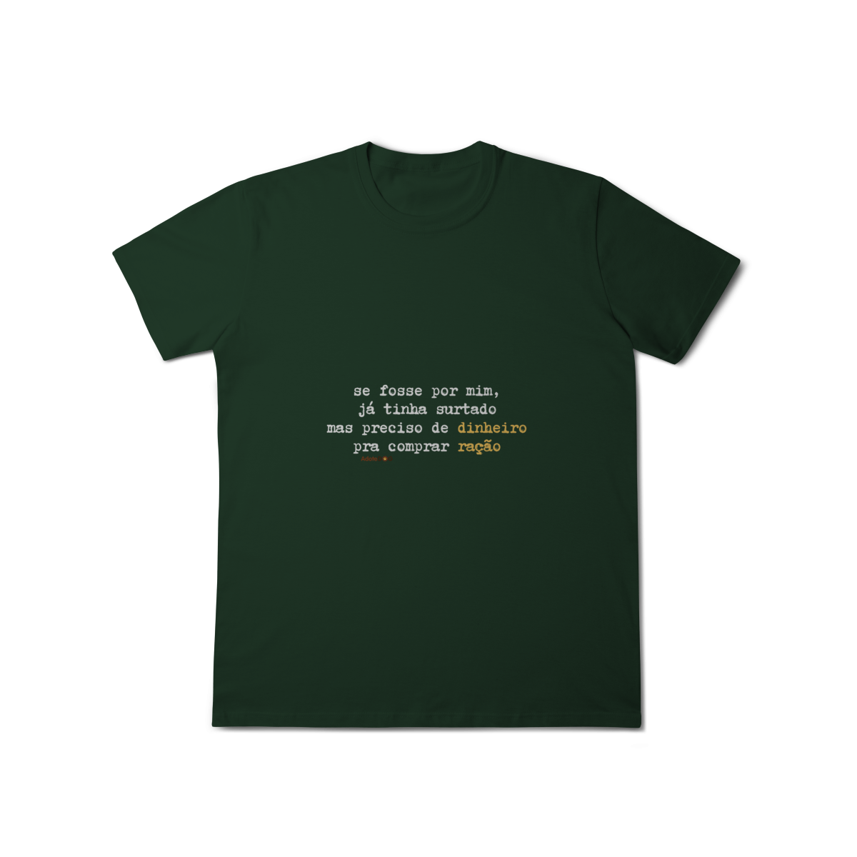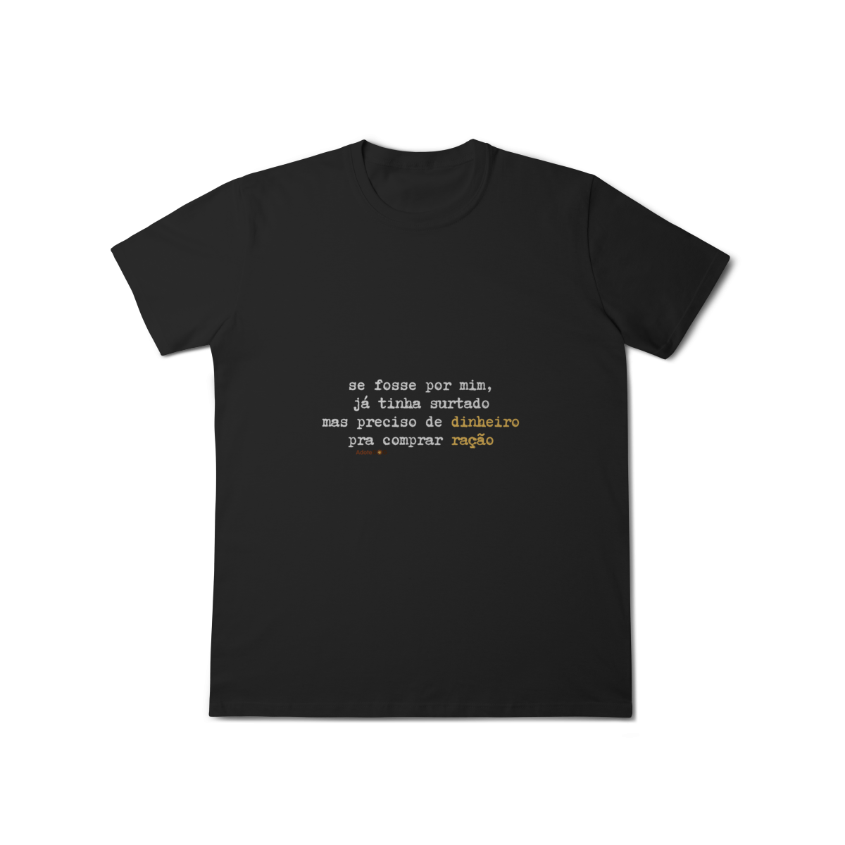 Uma camiseta que traduz perfeitamente a vida adulta de quem tem boletos, responsabilidades e um cachorro pra sustentar com amor. A frase “se fosse por mim, já tinha surtado mas preciso de dinheiro para comprar ração” mistura humor, sinceridade e aquela ironia que todo tutor entende na hora.